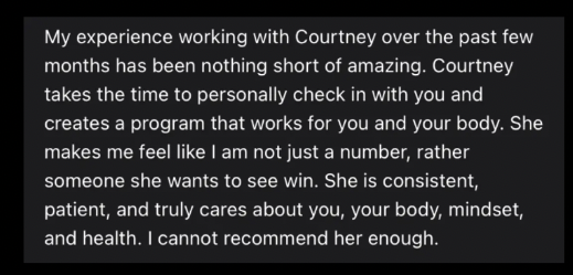 "Courtney helped me lose 45 pounds while actually eating more! Since working with Courtney, I have increased my strength and feel confident on what to do at the gym."